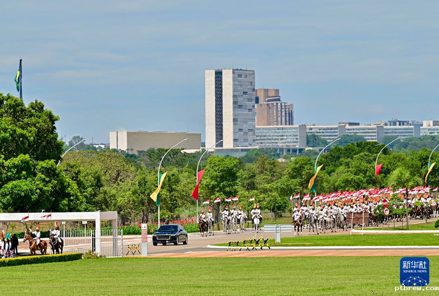 初夏时节的巴西利亚,天朗气清。黎明宫内,绿草如茵,450名威武礼兵整齐列队。在120名龙骑兵护卫下,习近平乘车抵达黎明宫前广场。