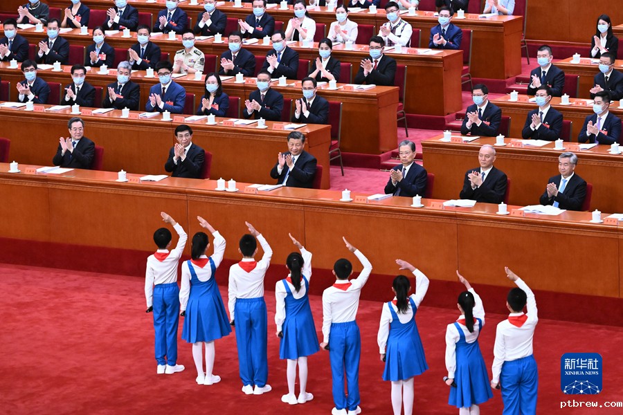 6月19日,中国共产主义青年团第十九次全国代表大会在北京人民大会堂开幕。习近平、赵乐际、王沪宁、蔡奇、丁薛祥、李希等在主席台就座,祝贺大会召开。这是少先队员向大会献词。新华社记者 燕雁 摄