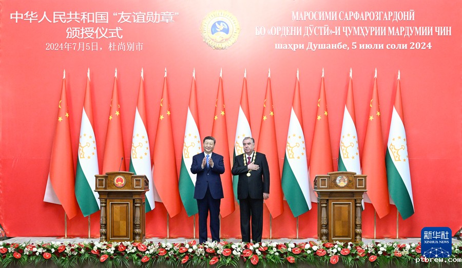 新华社杜尚别7月5日电(记者郑开君 史霄萌)当地时间7月5日下午,国家主席习近平在杜尚别总统府举行隆重授勋仪式,向塔吉克斯坦总统拉赫蒙颁授“友谊勋章”。