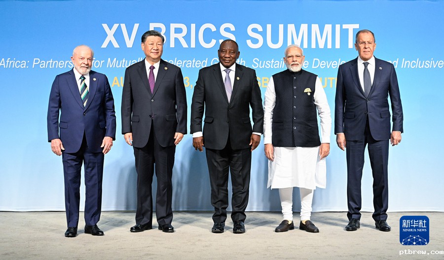 当地时间8月23日上午,金砖国家领导人第十五次会晤在约翰内斯堡杉藤会议中心举行。南非总统拉马福萨主持会晤。中国国家主席习近平、巴西总统卢拉、印度总理莫迪和俄罗斯总统普京(线上)出席。这是会晤期间,五国领导人集体合影。新华社记者 李学仁 摄